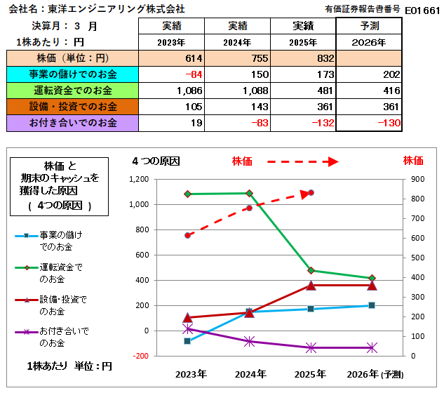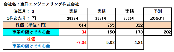 以上、東洋エンジニアリング(株)は、未だ「事業の儲けでのお金」が潤沢に獲得されているとはいえず、必ずしも良好な財務内容ではありません。しかし、今後の投資活動とその業績への反映が期待されることから、今年2026年3月決算の内容を注目したいところです。なお、「株価」が「事業の儲けでのお金」の何倍で推移しているかをみると、2024年が5.02倍であって2025年が4.81倍となっていますが、現在はさらに株価が急騰していますから、この倍率は跳ね上がっています。したがって、財務的には現在での株価急騰は、財務的な裏付けのないものであり、慌てて素人が手を出すようなものでないと判断します。