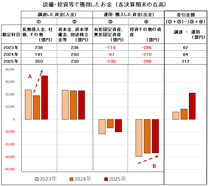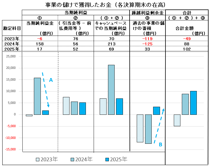 下図は「事業での儲けのお金」を、その四つの構成要素ごとに区分して表示した棒グラフです。当期純利益 (・・A ) は2024年になってようやくプラスの棒グラフになりました。したがって、2023年以前は利益ではなく欠損でしたから配当金の支出もなく、過去の事業の儲けのお金 (・・B ) も蓄積がなく、2025年に入ってからようやくプラスの棒グラフになりました。このような状況では運転資金に必要なお金や、設備・投資等に必要なお金を「事業での儲けのお金」でまかなうことは困難です。