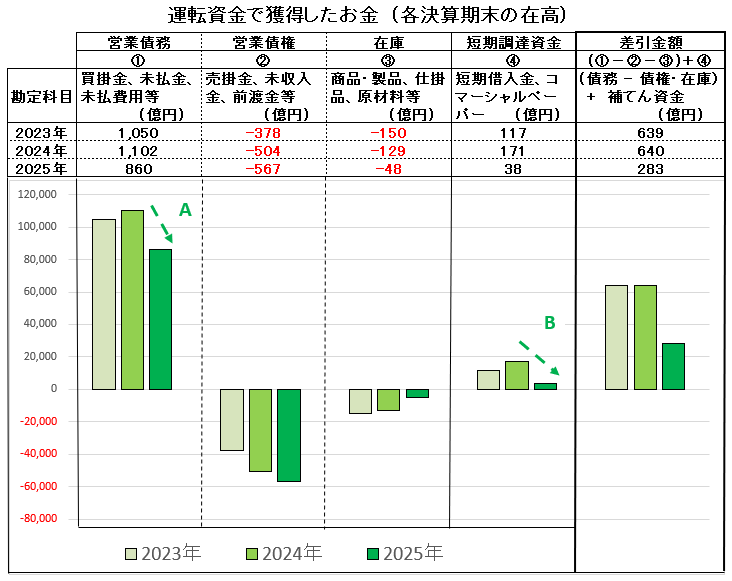 業績の回復とともに運転資金でのお金の内容も良くなって来ています。つまり、買掛金や未払金等の営業債務の残高も減少 (・・A ) するとともに、短期借入金の返済 (・・B ) も進んでいます。したがって、緑のグラフが2024年から2025年に急激に下降しました。