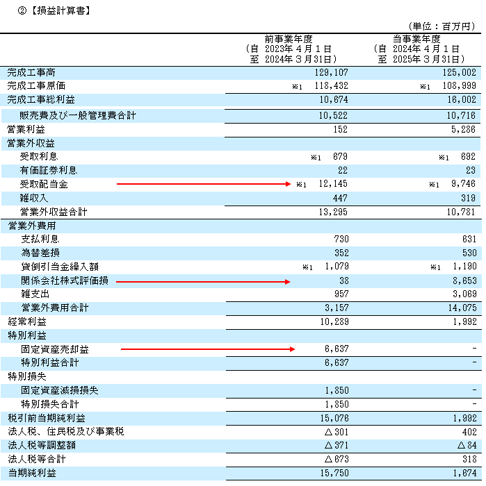 なお、2025年は2024年に比較して「当期純利益」が減少していますが、売上高や営業利益は増加しています。なお、当期純利益が減少した原因は営業外の収益・費用と特別利益(朱色の矢印)のためです。したがって、この損益状況が今後も続いていけば良好な財務内容に転じていきます。