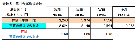 以上、三井金属は、極めて良好な財務体質です。したがって、株価が急騰するのもうなずけます。また「株価」が「事業の儲けでのお金」の何倍で推移しているかをみると、倍率は1.78倍と割安であることから、財務面からは今後も順調に株価は上昇していくものと判断されます。
