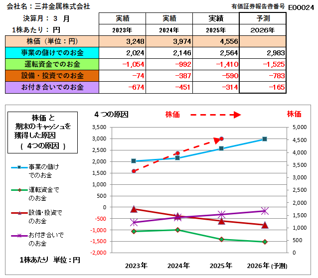 三井金属が毎決算期末に保有する現金・預金(キャッシュ)を、その獲得した4つの手段である①「事業の儲けで獲得したお金」、②「運転資金で獲得したお金」、③「設備・投資等の長期資金で獲得したお金」、④「お付き合いで獲得したお金」で区分し分析したグラフは下記のとおりでした。( なお、株価は「終値」でなく、有価証券報告書に記載されている各決算前の1年間の「最高株価と最低株価の単純な平均値」です。)