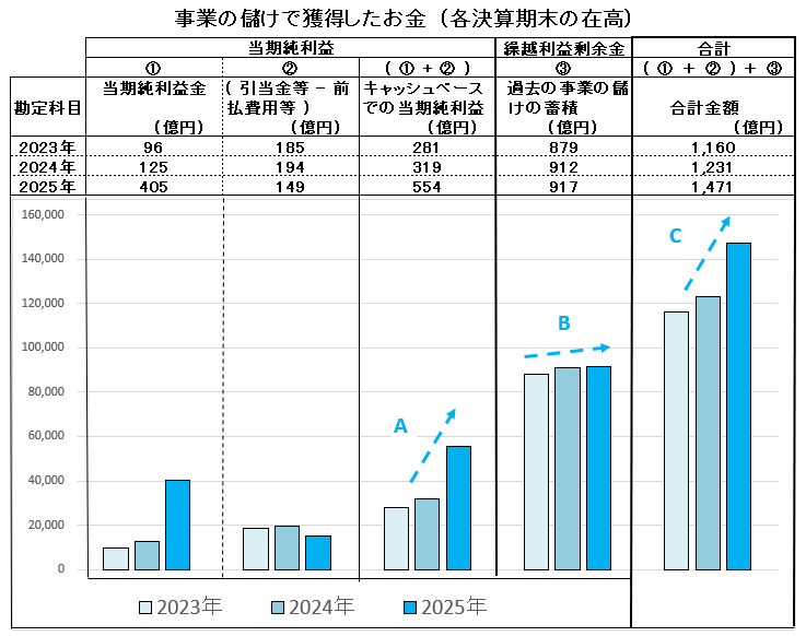 下図は「事業での儲けのお金」をその構成要素ごとに区分して表示した棒グラフです。当期の純利益は、キャッシュが出ているのに費用に計上されていない「前払費用」や、キャッシュは出ていないのに費用として計上されている「賞与引当金」などで計算されています。したがって、これらキャッシュの入出金でみた当期純利益は、下図の「A」になりますが、順調に伸びて良好な営業成績を示しています。