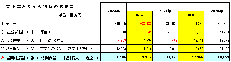 なお、過去の事業の儲けの蓄積 ( ・・B ) の伸びがあまり認められませんが、これは配当金が順調に支払われていることを意味しています。したがって、AとBの合計値 ( ・・C ) で、青色のグラフはプラスのはるか上位に位置して堅調に上昇しました。 下図で示した損益計算書の売上高及び各種の利益も大きく増加しています。