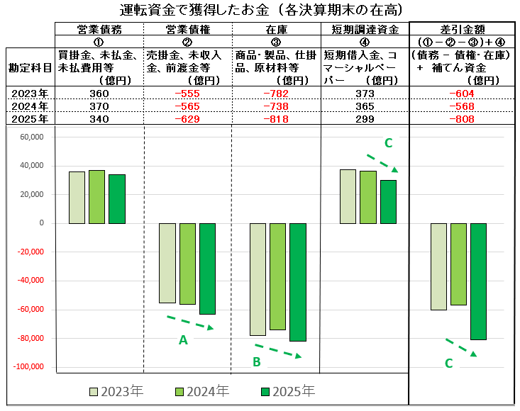 売上高及び各種の利益が大きく増加していることから、緑の「運転資金でのお金」の要素である「売掛金」などの営業債権(決算時点でまだ回収されていないお金・・A ) や「在庫」(・・B ) も増加するとともに、短期借入金 (・・C ) も減少していることから緑のグラフは下降しています。