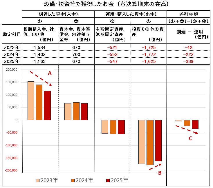 設備・投資等の調達資金である「長期借入金」の返済(・・A )も進んでいます。また、今期2025年は「投資その他の資産」の多少減少 (・・B )したことから 茶色のグラフである「設備・投資等でのお金」はマイナスの位置で下降しています。(・・C )。