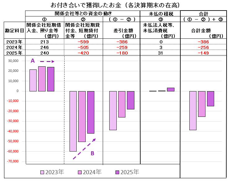 関係会社からの資金の調達 (・・A ) はなく、関係会社へ貸し付けていたお金である「関係会社短期貸付金」の回収 (・・B ) が進んでいます。この回収が進んでいるということは、何かと問題とされる子会社などの関係会社の財務悪化等は認められないことを示しています。したがって、この紫のグラフである「お付き合いでのお金」はマイナスの位置で少し上昇しています。