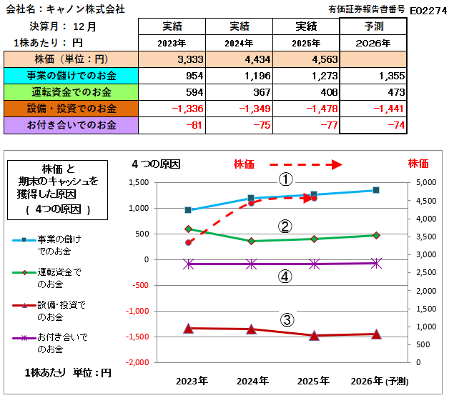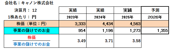 以上、キヤノン株式会社は良好な財務体質の企業です。また、「株価」が「事業の儲けでのお金」の何倍で推移しているかをみると、2025年3月決算期時点で3.58倍であり財務内容から見る限り割安です。したがって、財務的な判断からは、今後は株価は上昇して当然と判断されます。
