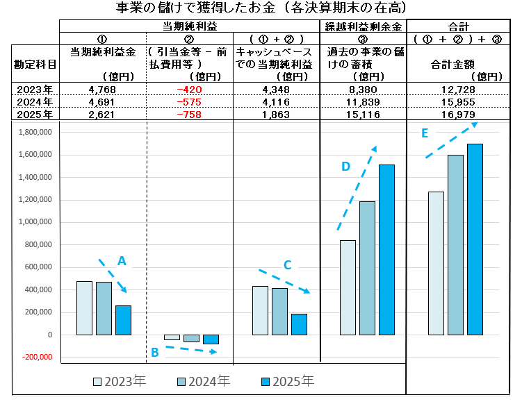しかし、過去の事業の儲けのお金から、配当金などを支払った残りのお金である「繰越利益剰余金」 (・・D )は大きく積み上がっていることから、青色のグラフ「事業の儲けでのお金」 (・・E )は順調に推移しています。