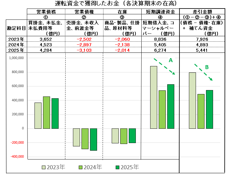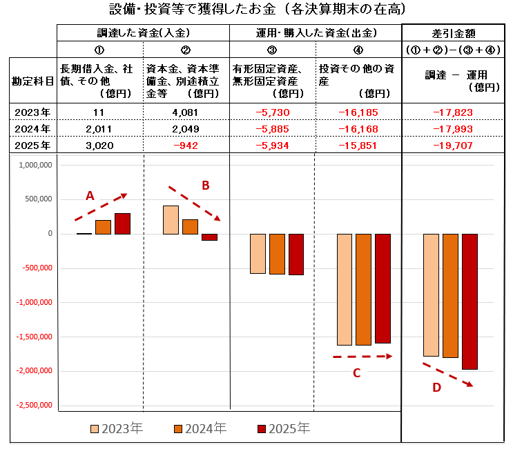 下図は「設備・投資等でのお金」をその構成要素ごとに区分して表示した棒グラフです。 長期借入金の在高が2024年12月決算では2,000億円、2025年12月決算では3,000億円と1,000億円増加 (・・A )しています。したがって、設備(工場・土地等の有形固定資産・ソフトウェアなどの無形固定資産)や、投資等(投資有価証券など)が増加してません (・・C )から、この「設備・投資等でのお金」はプラスに転じるはずですが、逆にマイナスの値が増加 (・・D )しています。なぜでしょうか。