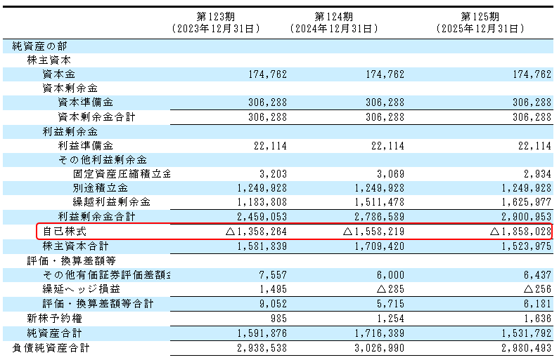 その原因は、資本金、資本準備金、及び別途積立金のように過去の「事業の儲けでのお金」を社外に流出させず社内に留保した資金が減少 (・・B )したためです。そして、その細かい内容をみると、下図の朱枠で囲んだ「自己株式」の増加によるものです。つまり、自社の発行株式を取得しているためです。株式を発行して取得したお金が「資本金」ですから、その株式を自社で買い取るとなると、「資本金」の減少(マイナス表示)となります。2024年12月決算では約1,000億円、2025年12月決算では約3,000億円もの自社株を取得しています。