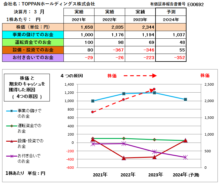 さて、TOPPANホールデイングス株式会社(旧:凸版印刷(株))が、毎年の決算期(3月)に獲得しているキャッシュを4つの原因ごとに、一株あたりで分析しました。2023年3月決算は、3ケ月遅れの昨年の6月に公開されましたが、はたしてこの公開された時点で、1年後に株価が上がるでしょうか、下がるでしょうか?、ぜひ、お考えいただければ幸いです。