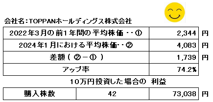 この2023年3月決算は、3ケ月遅れで昨年の6月末に公開されましたが、(その時点で株価が上がるのか、下がるのか、まったく不明です。) 今年の1月末日における株価を「月間相場表(日本取引所グループ)」で調べた結果は、月の最高株価と最低株価の単純平均ですが74.2%アップでした。