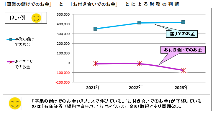 専門的なややこしい話となりました。この「事業の儲けでのお金」以外に「運転資金でのお金」「設備・投資でのお金」「お付き合いでのお金」について、下記にグラフと短い説明文を載せました。結論を言えば、このTOPPANホールデイングス株式会社(旧:凸版印刷(株))さんは、すべてにおいて極めて優れた財務内容です。