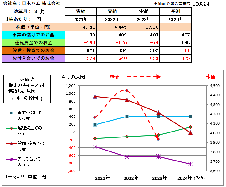 2023年3月決算期までの株価と財務数値のグラフを見て、2024年3月の株価を判断してください。
