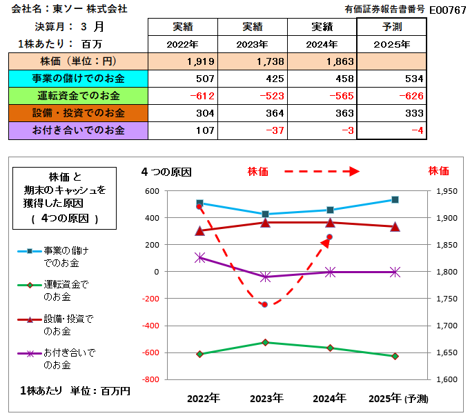 今年の2024年3月決算期までの株価と財務数値のグラフを見て、5ケ月後の2024年8月の株価を判断してください。( 考えたうえで「回答です !! 」を見てくださいね )