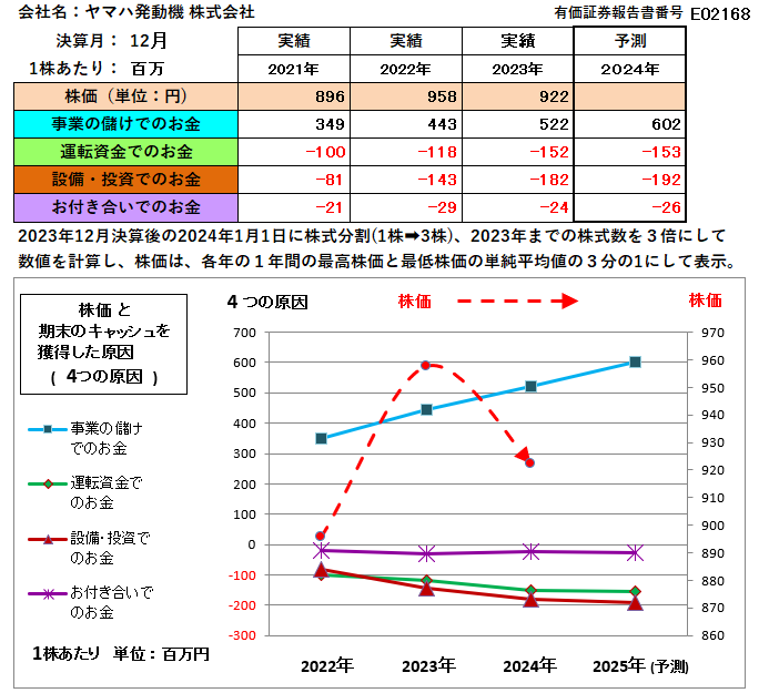 今年の2023年12月決算期までの株価と財務数値のグラフを見て、8ケ月後の2024年8月の株価を判断してください。なお、今期のスタートの2024年1月1日に株式分割(1株➡3株)されています。 ( 考えたうえで「回答です !! 」を見てくださいね )