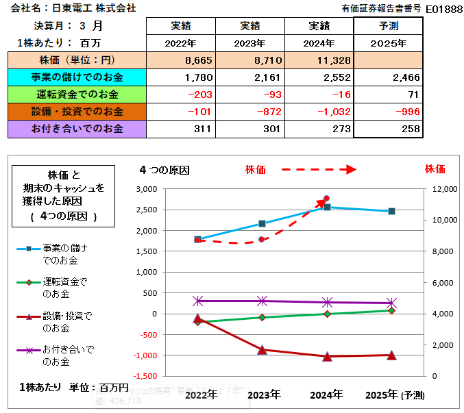 今年の2024年3月決算期までの株価と財務数値のグラフを見て、5ケ月後の2024年8月の株価を判断してください。( 考えたうえで「回答です !! 」を見てくださいね )