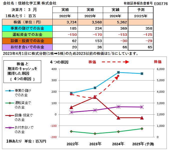 今年の2024年3月決算期までの株価と財務数値のグラフを見て、7ケ月後の2024年10月の株価を判断してください。( 考えたうえで「回答です !! 」を見てくださいね )