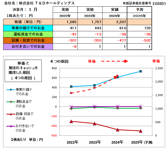 クイズ135・・T&Dホールディングスは、大同生命、太陽生命などを傘下に持っていますが、青色のグラフ「事業の儲けでのお金」が上昇しているし、「株価」が「事業の儲けでのお金」の何倍かをみると3.62倍と、前期に比べ低くなっているので、さらに株価は上がると判断した方は正解でした。なお、茶色のグラフが2024年に下降しているのは、その他の資本剰余金の減少(自己株式の消却)などのためで、財務的に問題視するものではありません。