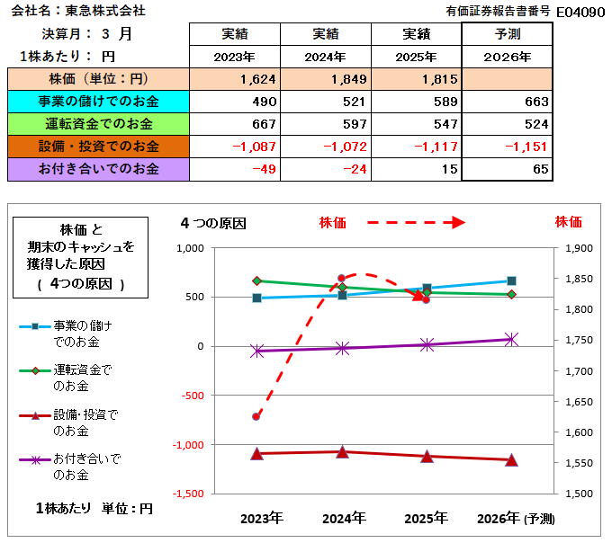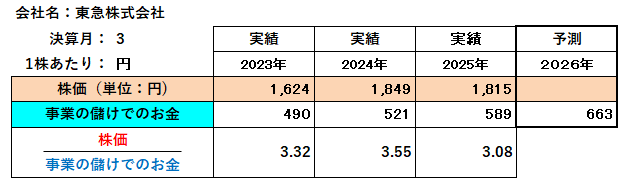 東急(株)は、「事業の儲け」が継続的に拡大しており、財務体質も改善傾向にあります。2025年には株価が企業の稼ぐ力に対して割安になっている状況であり、2026年にさらなる「事業の儲け」の拡大が見込まれることから、この差分が縮まる形で株価が上昇する可能性が高いと考えられます。