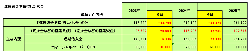 人工知能(AI)の回答をご紹介します。人工知能(AI)には青、緑、茶、紫の各々のグラフの変化の原因が分かるように、その各々四つの内訳表を提供しています。下記のカラーの図表がそれです。なお、人工知能(AI)は、「短期借入金」の残高が多額のため緑色グラフの「運転資金でのお金」が異常に高い位置にあることの財務上の問題点 ( 今後金利の上昇を考慮したら大きな問題があります。 ) の指摘はなく、逆に短期借入金が圧縮され「財務の健全性の向上」したと前向きに判断していました。また、「コマーシャルペーパー」の増加に対する問題も指摘していませんでした。