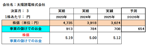 現在の株価が3,624円(2025年3月期末)であるのに対し、主要なキャッシュ創出能力を示す「事業の儲け」がさらに減少する予測であることから、株価はさらなる下落圧力を受けると考えられます。