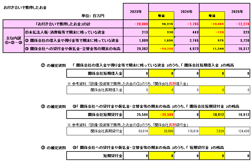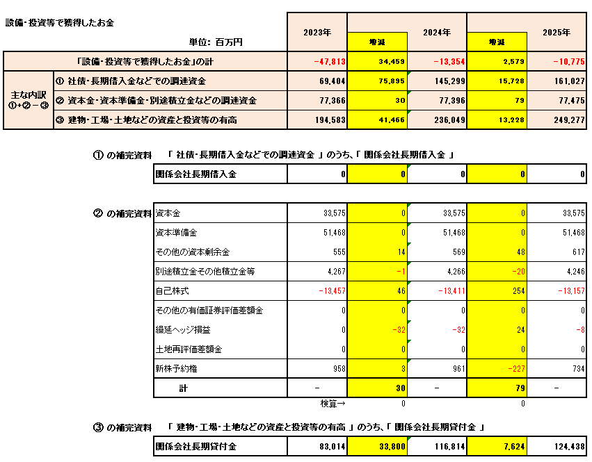 • 内訳を見ると、「関係会社への貸付金や仮払金・立替金等」が大きく影響しており、2025年はここからのキャッシュ流出が主因となっています。貸借対照表でも関係会社長期貸付金が増加傾向にあります。