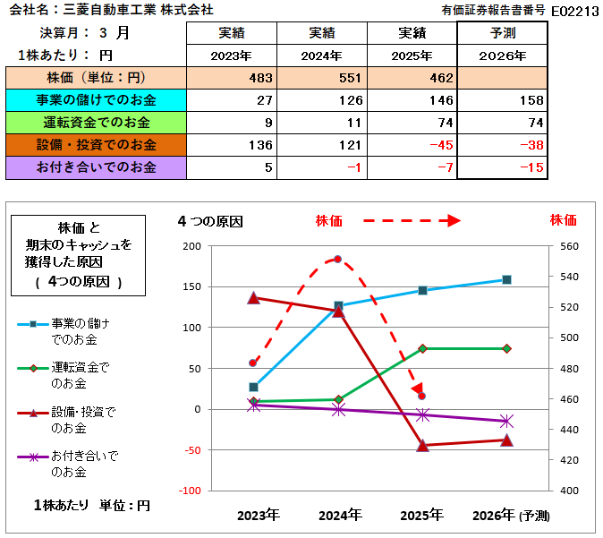2025年3月決算までの株価と財務数値のグラフを見て、3ケ月後の 2025年 6月の株価を判断してください。 ( 考えたうえで「回答です !! 」を見てくださいね 。) なお、この三菱自動車工業(株)は前年の2024年3月決算の分析グラフで2024年10月14日に「株価当てクイズ・・75」を投稿していました。