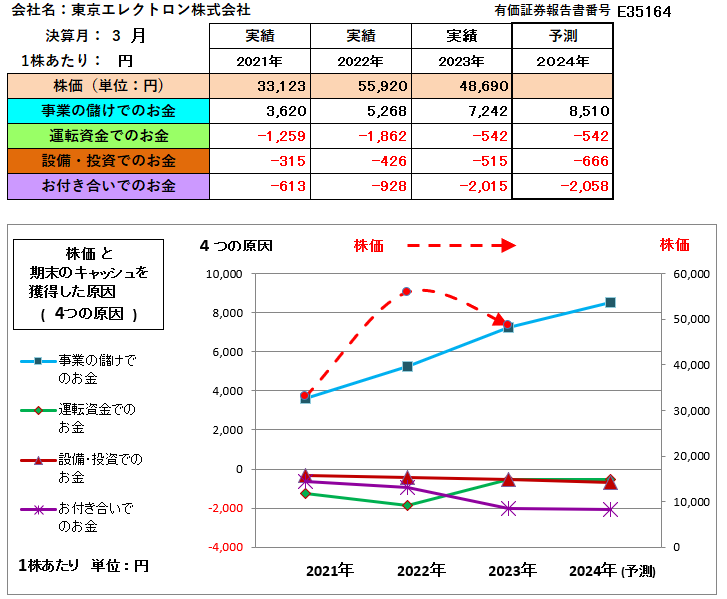 クイズ1・・「事業の儲けでのお金」が順調に伸びているので、株価は上がると考えた方は正解です。株価は財務内容だけでなく他の社会的・経済的な要因でも動きますが、財務内容が基本です。なお、2023年4月1日付で1株を3株とする株式分割がありましたから「2023年3月の前1年間の平均株価」÷3で計算しています。